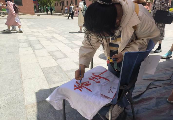 在本次涂鸦活动中,来自全校各学院的青年们在白色衬衫与白色帽子上进行绘制,各学院学子们用画笔和斑澜的色彩,淋漓尽致地展现自己的画工;用各自独特的视角,描绘着心中对青春风采、五四精神的认识理解;用独具匠心的构思与创意,让缤纷的色彩搭乘创意的翅膀在画布上自由飞翔。线条的勾勒,色彩的填充构成了一幅幅富有自由且清新的画面。同学们根据主题在现场即兴创作的各种艺术字,颜色艳丽,创意十足,现场气氛活跃,吸引了众多同学前来观看参与。