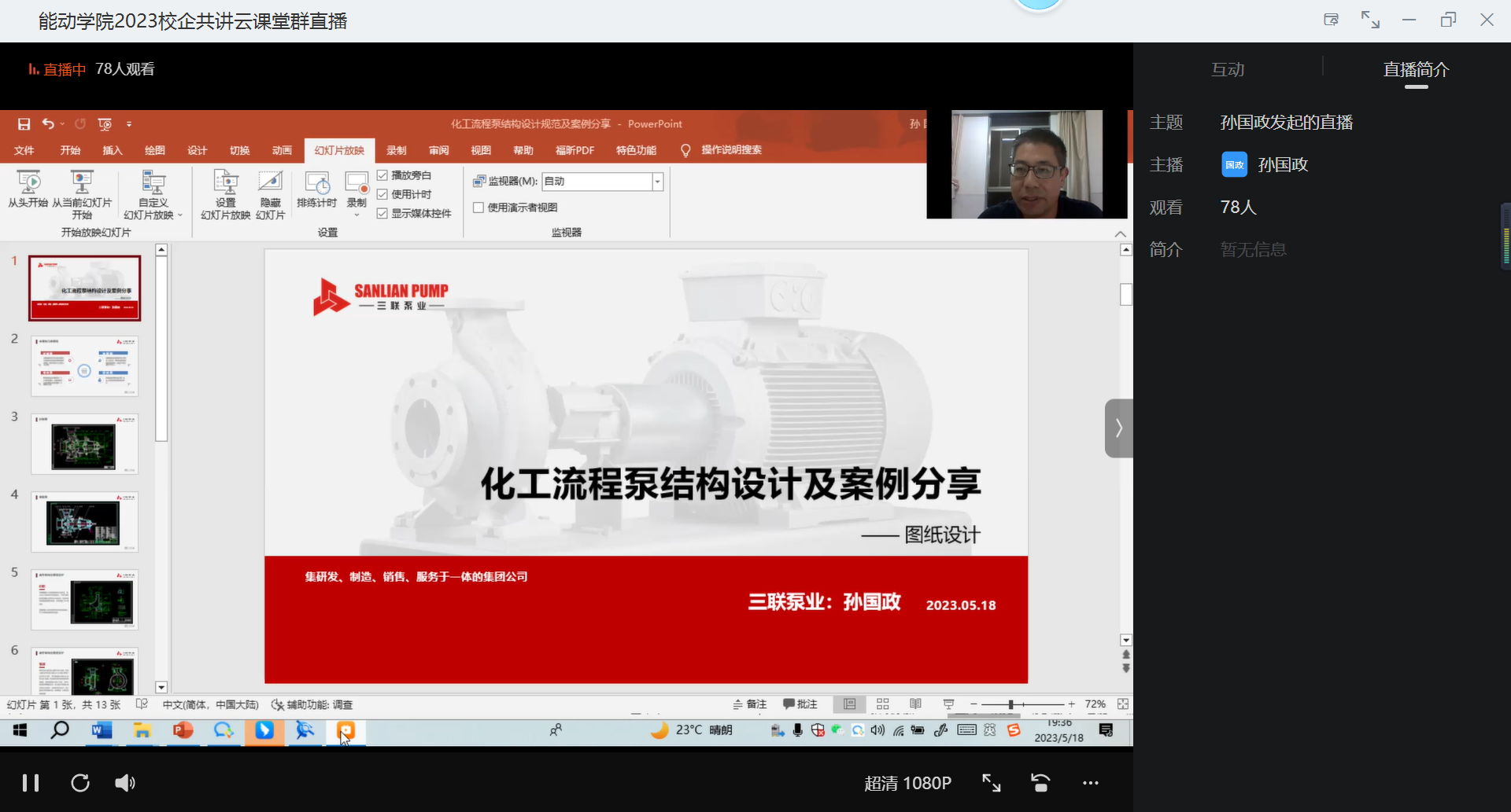 讲座中两位企业专家结合不同泵结构图纸、系列产品,从泵零件设计及整体装配等方面对离心泵设计过程中的关键知识进行了详细讲解;同时,针对同学们设计中存在的一些普遍问题,结合自身丰富经验,为学生及老师们进行了真诚的分享。此次校企共讲云课堂对提升我校能源与动力工程专业学生工程实践能力及毕业设计质量具有很大的帮助。(撰稿:陈学炳;审核:章小成)