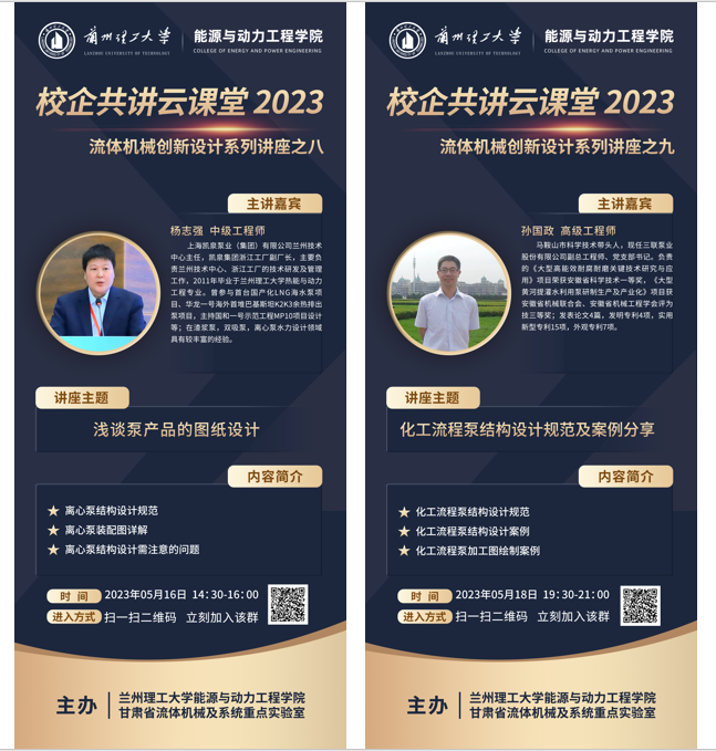 2023年5月16日下午及5月18日晚上,能源与动力工程学院“校企共讲云课堂”系列讲座八、九开讲。应学院邀请,上海凯泉泵业(集团)有限公司兰州中心主任杨志强、三联泵业股份有限公司副总工孙国政两位工程师为能源与动力工程专业师生就离心泵及化工流程泵结构设计规范及设计中需要注意的问题进行了线上讲解辅导。2023届能源与动力工程专业全体本科生、流体机械系青年教师及部分研究生等170余人参加此次讲座。