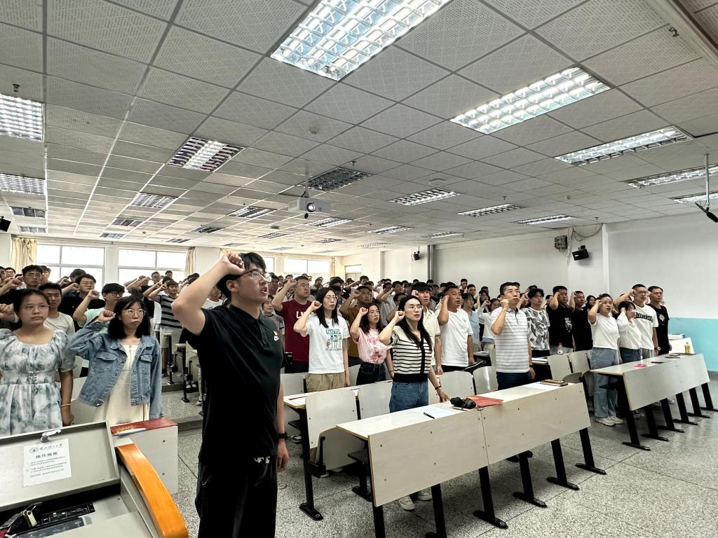 毕业生党员代表曾猜代表全体毕业生党员发言,他回顾了自己四年的成长与收获,入党历程,向学校、老师和校友们送上真挚的祝福。随后带领在场全体党员重温入党誓词。庄重的宣誓仪式,让党员同志们更加坚定了入党信念和为共产主义事业奋斗终身的决心,踔厉奋发,勇毅前行。