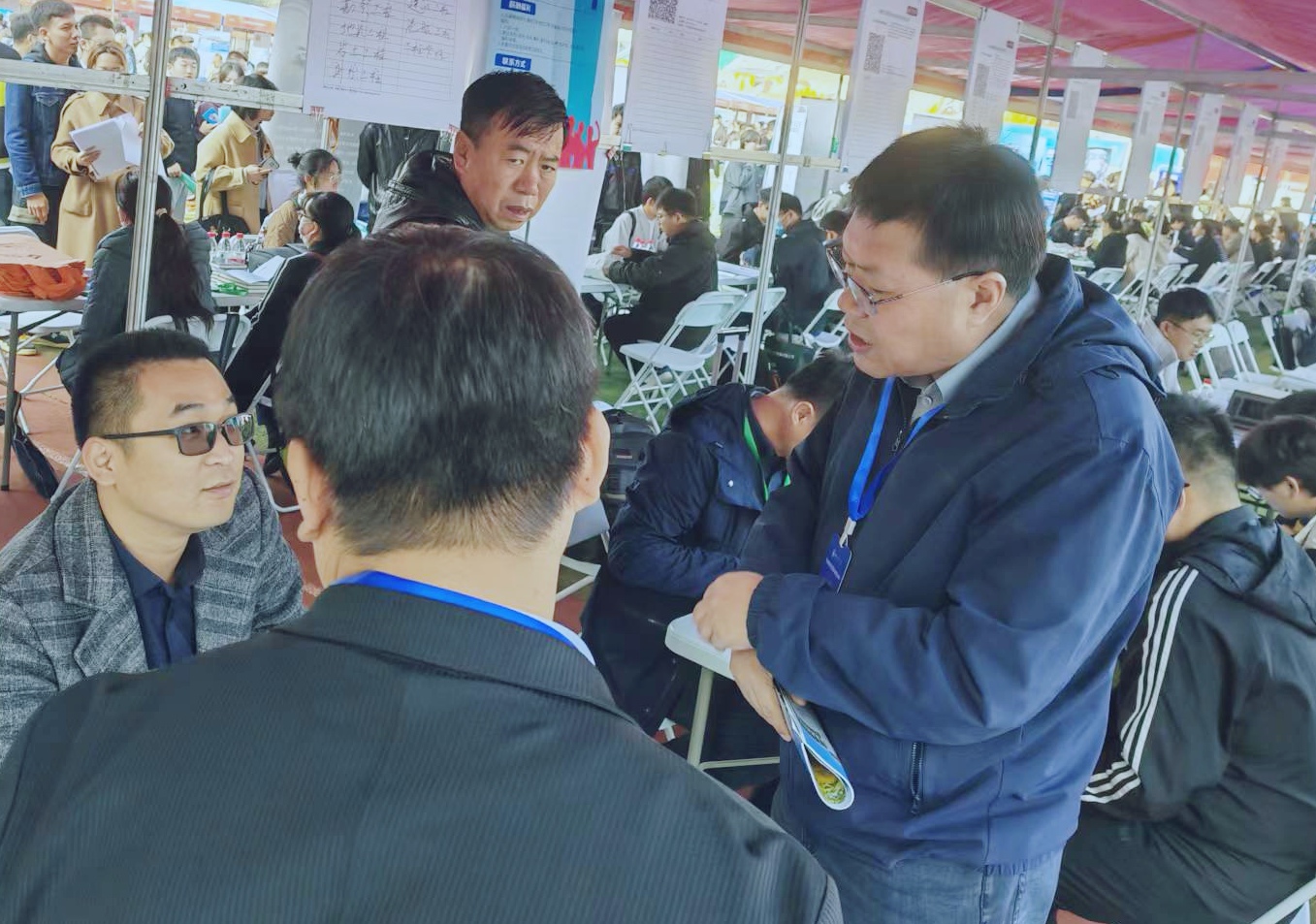 在10月14日的双选会中,经济管理学院党委书记穆龙、院长李亚兵、党委副书记王翀、全体辅导员、毕业班班主任到场主动与用人单位对接交流,了解用人需求,有针对性的推荐毕业生,助力学生就业。
