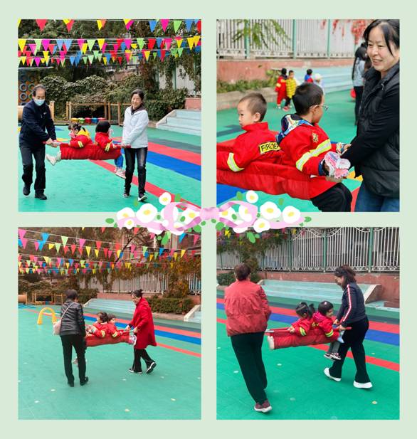 闯关方式:两名家长依次从上一关“救援冲冲”回到起点后在侧面用一副担架运送两名小朋友从起点至终点 ,体验火灾现场的急速救援。
