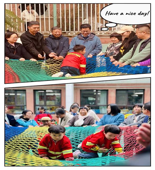 闯关方式:指定好的家长及老师站于队伍两侧,保持闯关消防网的平衡,幼儿成队按顺序进行攀爬比赛。
