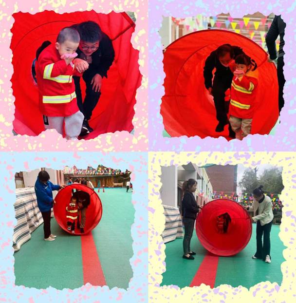 闯关方式:火焰隧道就是火灾场景模拟,游戏规则以班为单位分成两组,一名家长携带一名幼儿,弯腰低姿进入火焰隧道,快速逃出隧道为闯关成功。