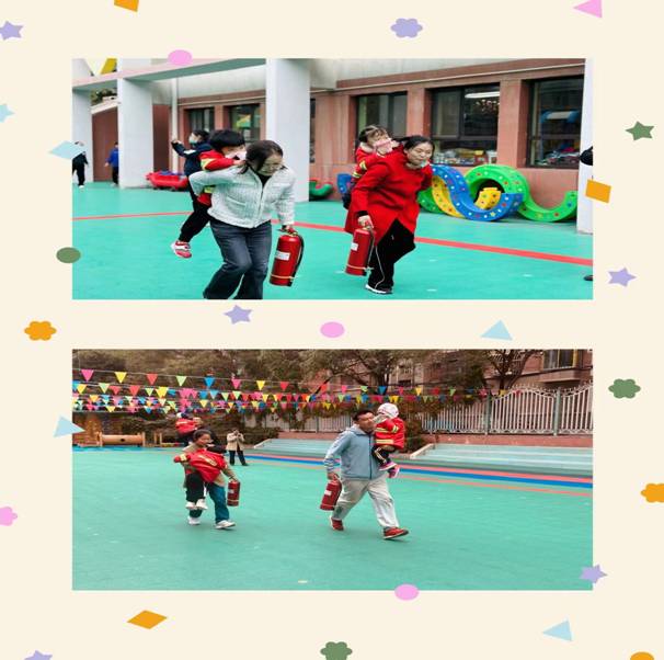 闯关方式:两组家长依次从“穿越火焰隧道”隧道里出来以后,背或者抱一名幼儿提上一支灭火器从消防闯关通道的一端到另一端,再从终点到起点进行来回冲刺跑,体验消防员火灾现场极速冲刺感和救火救人的使命感。