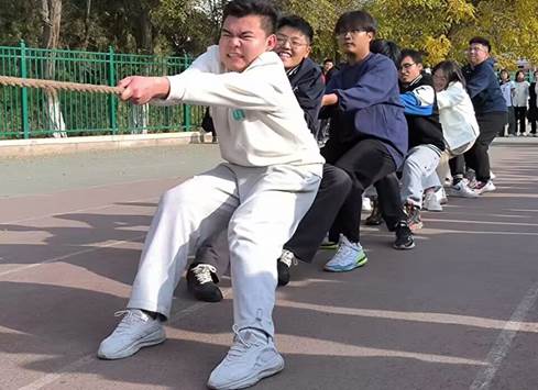 本次比赛各支队伍需派出男生10人,女生5人进行比赛。裁判哨声未响,上场对阵的队伍就蓄势待发的做好了拔河姿势准备迎战。哨声响后,各支队伍比赛时都涨红了脸、卯足了劲拼命的往后拉,未参赛的同学都扮演啦啦队的角色为自己的队伍加油鼓劲,整个比赛期间选手们高喊“一二一”的节奏声夹杂着拉拉队员的加油声以及观众的喝彩声在田径场上此起彼伏,非常热烈。
