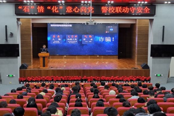 为增强学生的网络安全意识,提高对电信诈骗的识别和防范能力,11月21日下午,石油化工学院在彭家坪校区问鼎堂106报告厅开展以“石情化意心向党,警校联动守安全”为主题的“反诈”教育,甘肃省公安厅刑侦局网络犯罪支队副队长韩生彪担任主讲,学院2023级全体新生参加。
