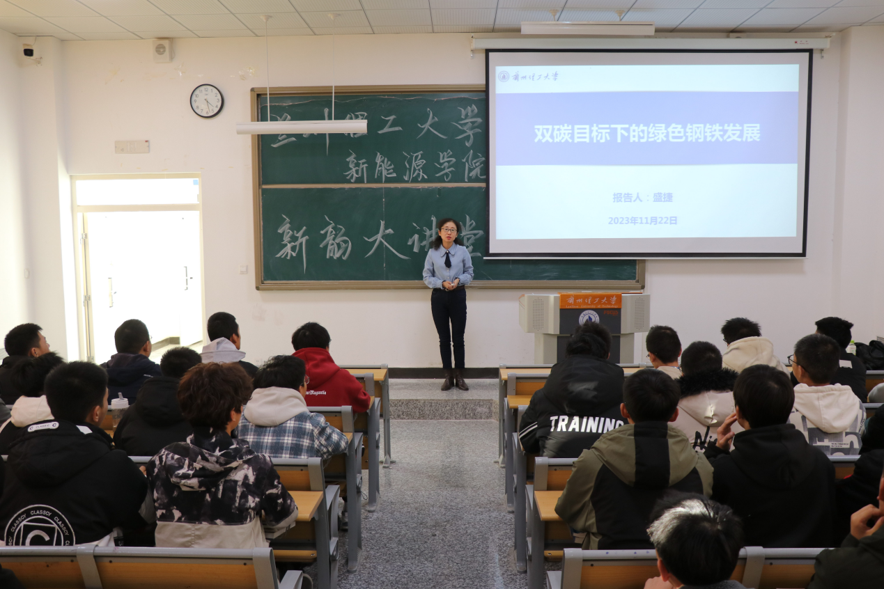 硕士生导师盛捷作《双碳目标下的绿色刚铁发展》的专题讲座,她指出绿色钢铁发展是指在钢铁行业中采取环保、可持续的生产方式,作为新时代新能源专业的学生,不仅是绿色低碳交通体系的参与者,更是战略措施的制定者、执行者,双碳目标下的新能源专业人才大有可为。