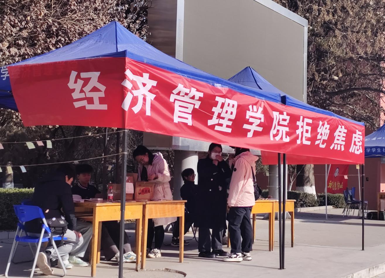 为帮助同学们告别焦虑,更好地把握生活节奏,促进大学生德智体美劳全面发展,12月3日,经济管理学院在彭家坪校区红柳广场开展拒绝焦虑心理主题活动。