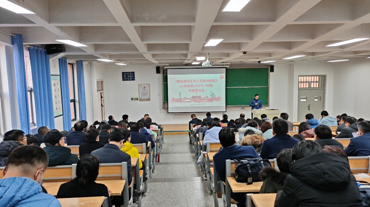 为进一步规范事业单位工作人员行为、严肃规矩纪律,落实学校关于学习《事业单位工作人员处分规定》(以下简称《规定》)的通知要求,12月12日下午,理学院在观成楼204教室召开《规定》专题学习会。学院党委书记张维权领学并解读了《规定》,学院全体教职工参加。