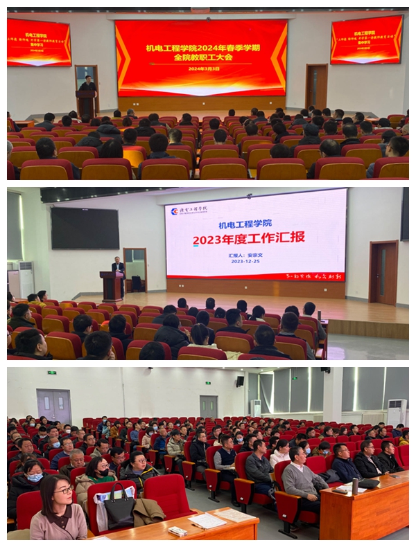 会上,学院院长安宗文汇报了学院2023年工作总结,围绕学院去年在教学、科研、管理、服务等方面工作取得的成绩和存在的不足向大会做了详实的汇报。并就学院2024年重点工作计划做了介绍,他鼓励学院年轻博士要牢记机电精神,把握当前机遇,不怕吃苦,勇于奋斗,扎实提升教育教学技能和科研水平,争取早日成为学院高质量发展的“顶梁柱”。最后,他强调全院上下要振奋精神,按照学校2024年工作目标导向和要求开展各项工作,保持久久为功、善作善成的恒心和韧劲,脚踏实地、埋头苦干,推动各项工作取得扎实成效。(撰稿人:巨龙;审核人:党渭平)