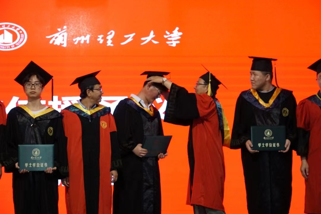 冯涛院长向为获得硕士学位的研究生毕业生代授予学位,拨苏正冠。导师们为获得学士学位的全体本科毕业生授予学位,拨苏正冠。
