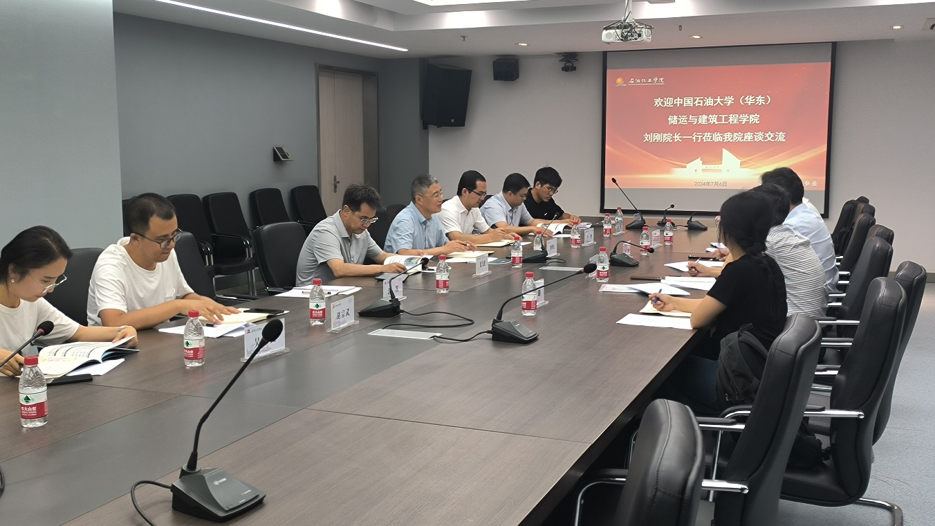 2024年7月6日,中国石油大学(华东)储运与建筑工程学院院长刘刚、副书记周辉、油气储运工程系主任卢兴国、教师代表姜璐一行来石油化工学院调研交流。石油化工学院副院长(主持工作)李世友、副书记张飞龙,油气储运工程系主任李楷及相关教师参加交流座谈。