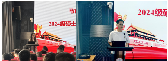 在校生代表王敏和新生代表崔君豪先后进行了发言。王敏分享了自己在专业学习、实践生活、学术研究等方面的体会,鼓励师弟师妹们要学习马列经典,关注热点,合理规划学习和生活,让三年研究生生活过得充实且有意义。崔君豪代表全体新生表达了对未来学术生活的憧憬与期待,郑重承诺将珍惜在马院的学习机会,刻苦钻研、勇于创新,努力成为有理想、有本领、有担当的时代新人。