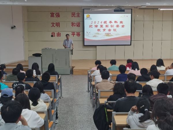 为帮助2024级新生树立起良好的纪律意识,顺利完成军训任务,2024年9月26日,石油化工学院组织召开了2024级本科生校纪校规教育暨军训安全教育大会。学院党委副书记张飞龙、新生辅导员及2024级全体学生参会。