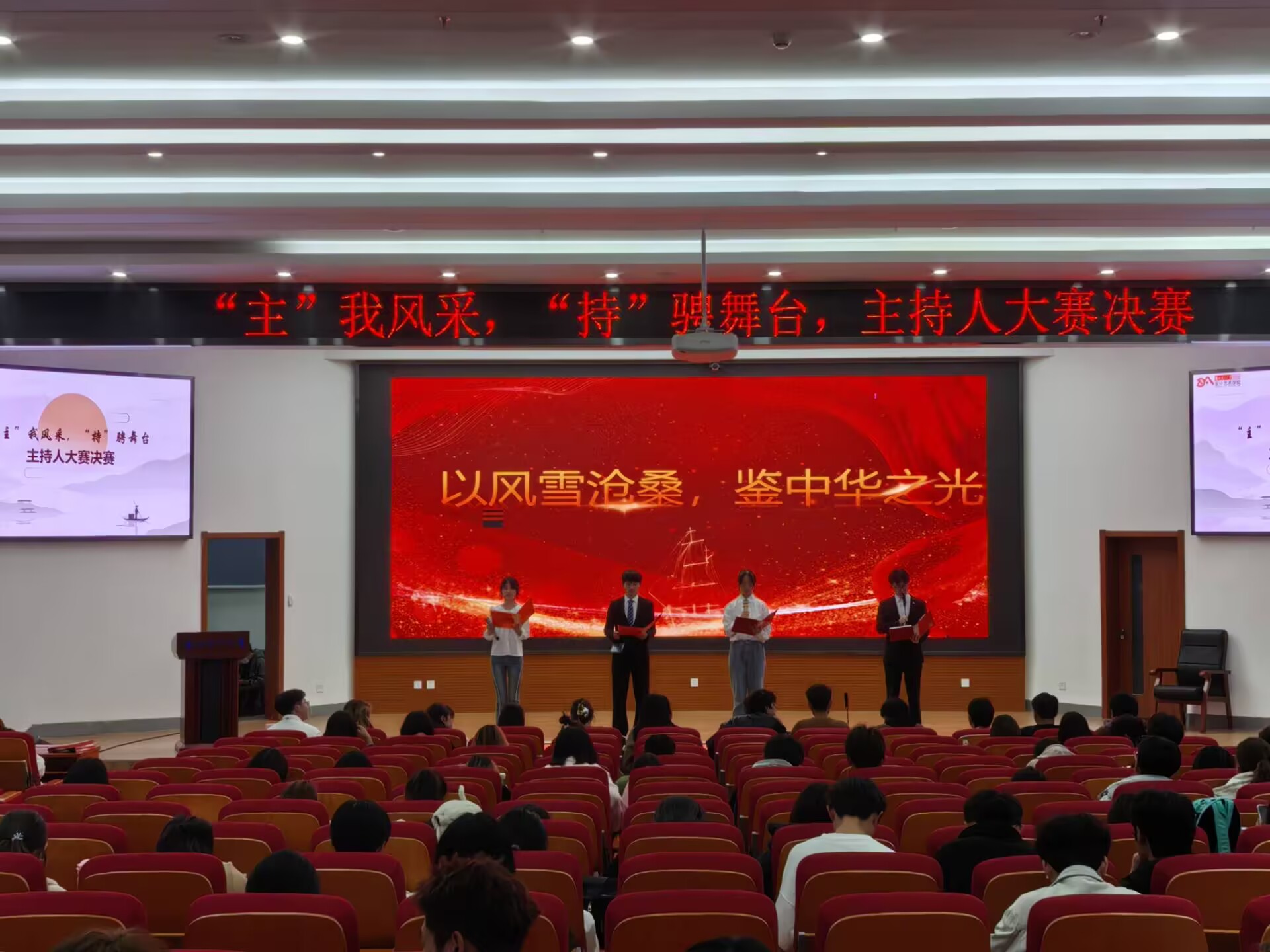 大赛决赛共分为两轮,流程设计丰富而紧凑,全面考验选手的综合能力。第一轮比赛涵盖诵稿、问答及才艺展示环节。诵稿时,选手们以富有感染力的声音,将每一篇稿件的情感与内涵生动呈现;问答环节中,他们思维敏捷,展示出出色的应变能力;才艺展示部分更是精彩纷呈,选手们各展所长,通过唱歌、舞蹈、朗诵、乐器等方式展现了他们的多才多艺。第二轮为90秒自由发挥环节,极具挑战性。选手们需从给定的关键词中随机选择,随后进行90秒即兴演讲。在这一环节,十二位选手表现得沉着冷静,用精彩的表达在舞台上编织出属于自己的独特篇章。经过两轮激烈角逐,23级建筑学王璐、23级产品设计刘美含、23级城乡规划韩海宸以及22级产品设计高琳继四位同学脱颖而出,荣获“优秀主持人”称号,其余13名参赛同学获得积极参与奖。