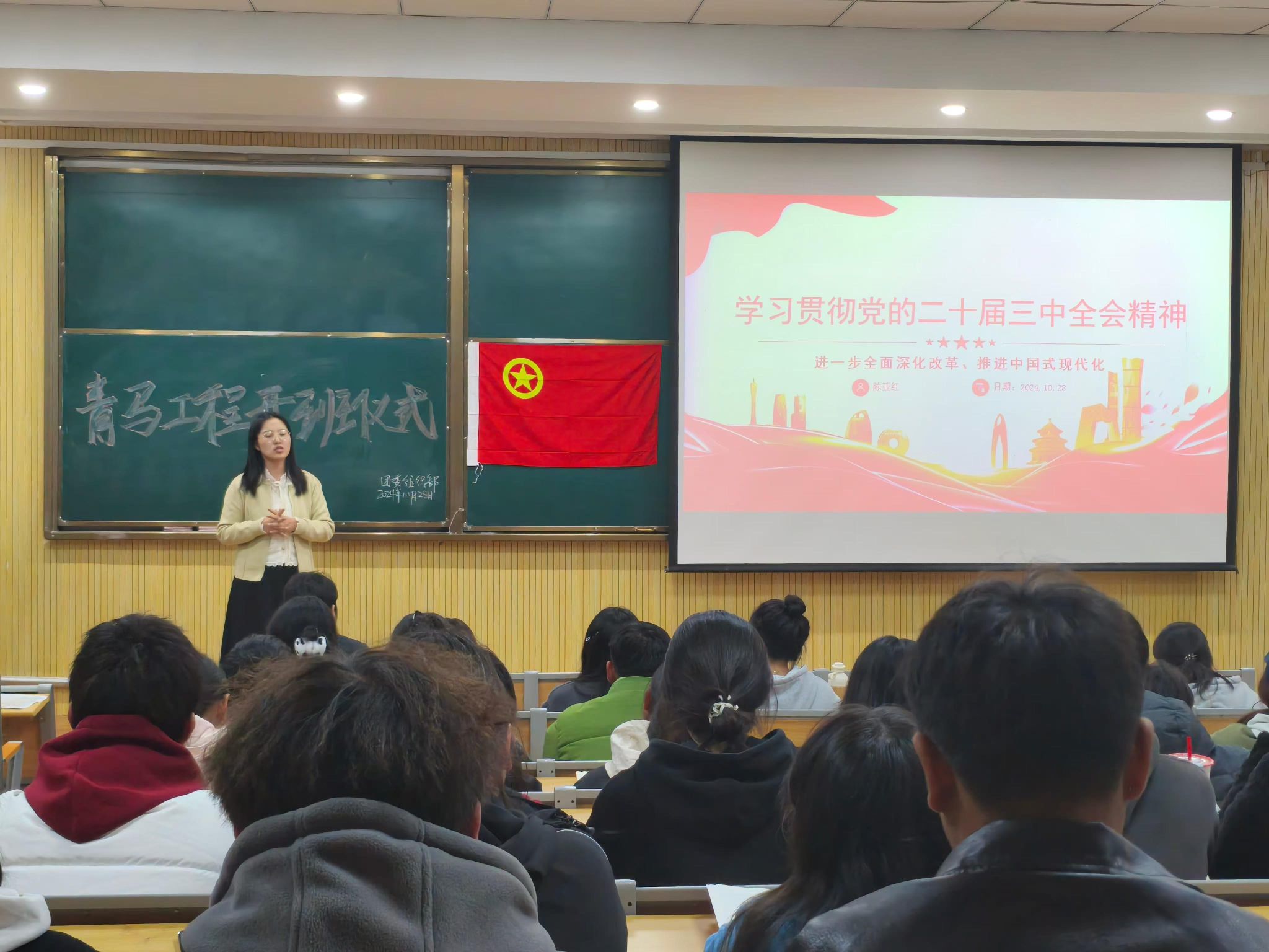 10月29日晚,设计艺术学院于兰工坪校区琢玉楼124教室开展2024年秋季学期“青马工程”开班仪式暨第一讲。马克思主义学院教师陈亚红、学院团委书记宋美瑾以及73名青马班学院参加开班仪式。