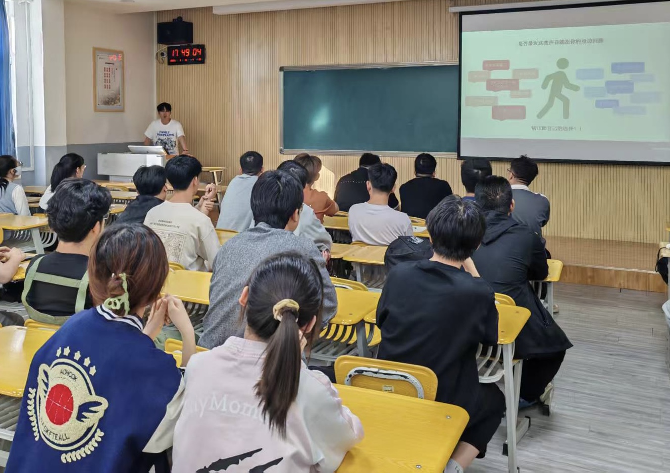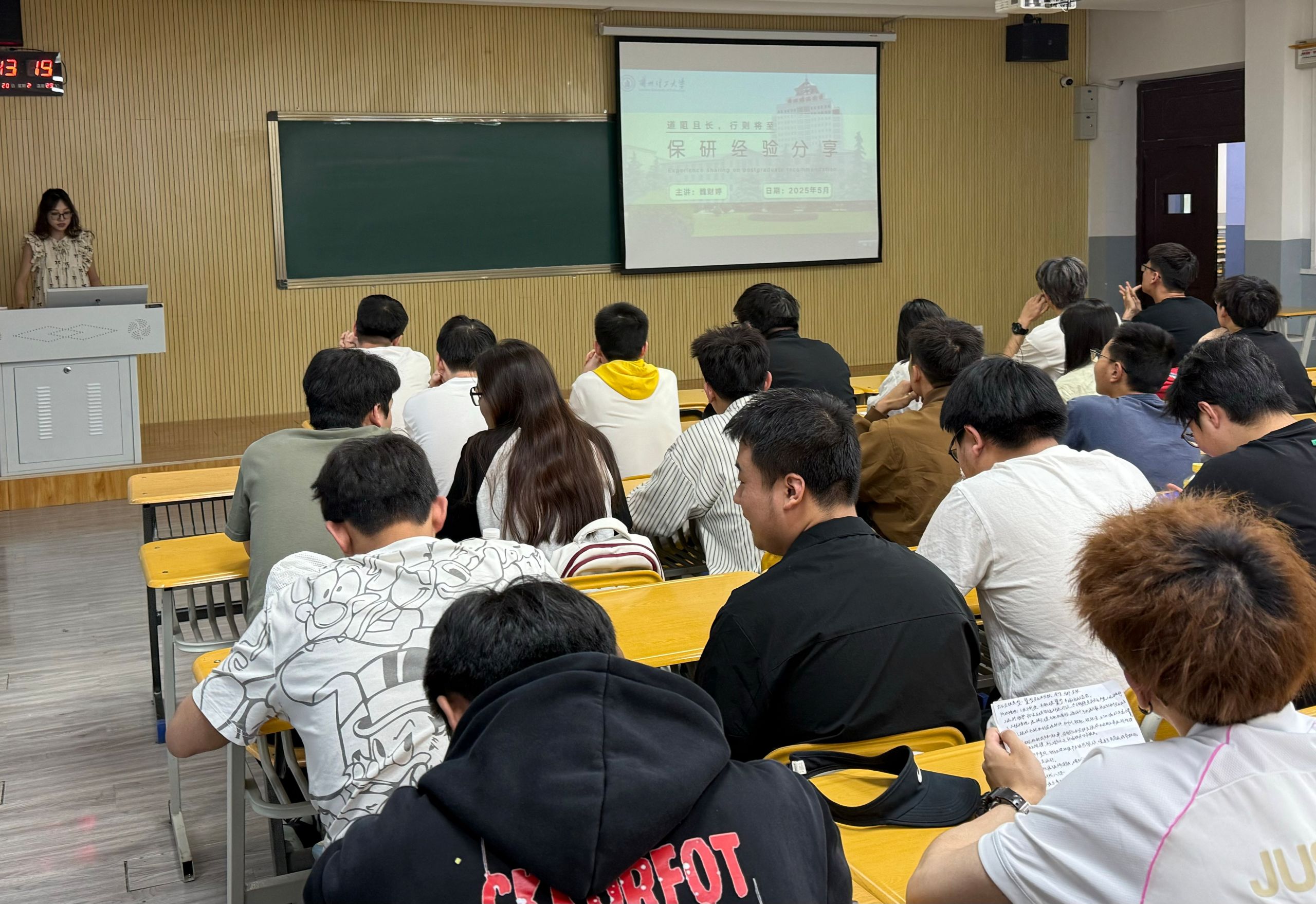 活动中,辅导员周婷简要阐述了当前考研、保研竞争的激烈态势。保研至华北电力大学的魏财婷从“材料准备”“面试技巧”“院校选择”三方面展开分享。考研至北京航空航天大学的王彬则分享了复习规划与心态调整方法。现场,与会学生围绕考研院校选择、复试准备等具体问题踊跃提问,气氛热烈。