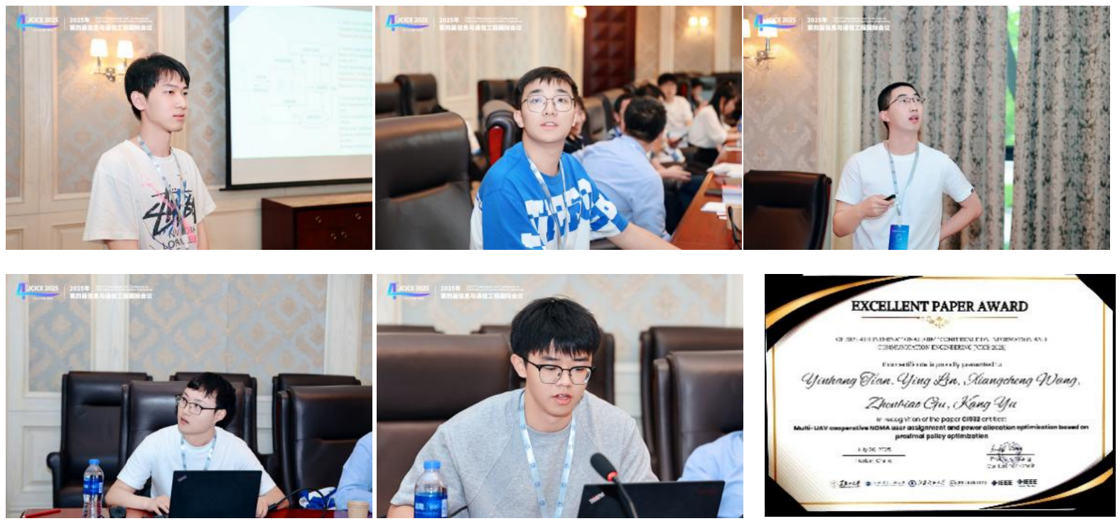 会议期间,蔺莹老师及团队的硕士研究生李昊旻、张思飞、田引航和王想成,陈海燕老师的硕士生周毅分别作了学术报告。张思飞的报告,分享了在NOMA下行链路进行功率分配,实现了最大化最小用户信噪比的相关研究成果。李昊旻的报告,针对RIS-NOMA系统中的复杂系统性能优化问题提出了一种解决方案,通过引入深度强化学习算法,有效提升系统性能并满足多场景需求。王想成的报告,构建Double DQN-DDPG网络模型,利用已经构建好的网络模型去进行用户分组和功率分配,目的是为了最大化系统和速率,提升通信质量。田引航的报告,针对用户位置信息存在测量误差的实际场景,通过建立马尔可夫决策过程模型,系统以保障用户公平性为约束条件,并以用户最低速率最大化准则构建优化目标函数。周毅的报告,针对多元时间序列长期预测中传统移动平均分解对突变数据不敏感、以及时间戳特征编码缺失导致精度受限的问题,提出了一种新模型。田引航的大会论文荣获“优秀论文奖”。