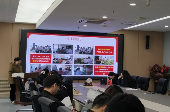 随后,本科生党支部杨茹、刘美琪等党员结合自身参与的实践经历,分享了践行“红柳精神”的生动案例。杨茹同志分享了参与针对高中女生开展的关爱乡村贫困女童的公益项目。刘美琪同志则介绍了赴基层乡村参与特色食品调研、走进文冠果茶叶生产线和种植基地,详细了解甘肃省特色作物、助力靖远枸杞推广的实践感悟。