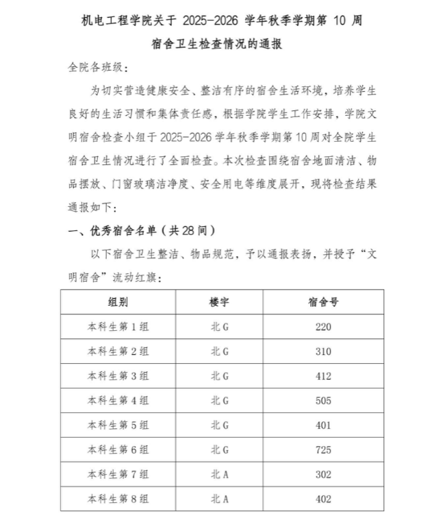 学院通过明确奖惩机制激发学生参与热情:对优秀宿舍授予“文明宿舍流动红旗”及奖品,并将红旗在宿舍门口展示一周以作示范;对卫生差、不合规宿舍,予以通报批评并责令限期整改,后续还将重点复查整改效果,推动问题切实解决。