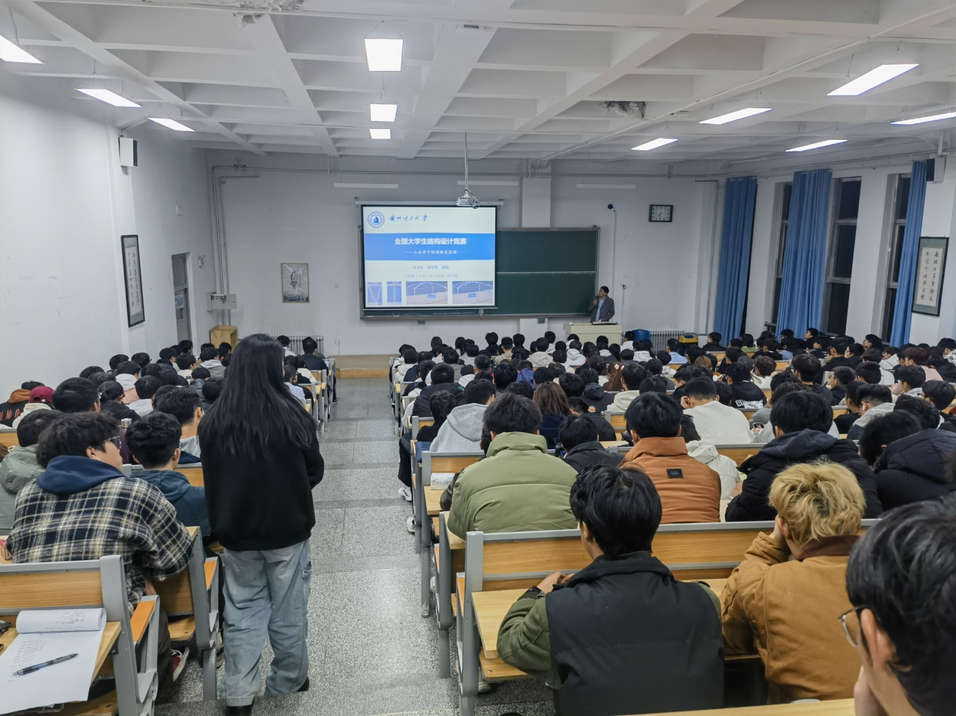 为增进学院本科生对土木水利领域重点学科竞赛的认知,全面提升学生的专业竞技能力与创新素养,助力学院在重点赛事再创佳绩,11月4日,土木与水利工程学院在彭家坪校区集贤楼308教室举办重点学科竞赛系列讲座第一讲——全国大学生结构设计竞赛专题讲座,学院2024级、2025级共300余名同学积极参加。建筑工程系冉永红老师担任主讲,袁华智、金悦老师以及在结构竞赛中获得优异成绩的学生代表参加。