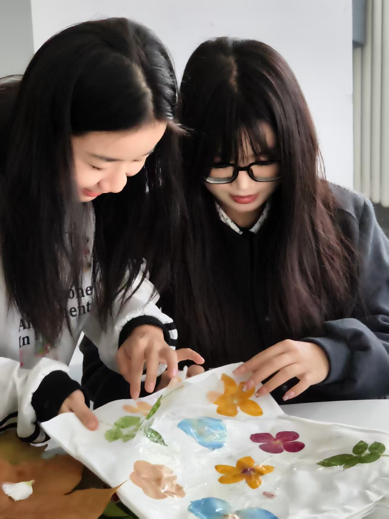活动现场,金悦老师首先向研究生新生介绍了植物拓染的历史渊源,以锤击拓印的传统手法,将花草的形态与色彩“复刻”在布料上,这种“敲敲打打”的创作过程,本身就是一种情绪的宣泄与压力的释放。大家手握小锤,在布料上轻轻捶打植物叶片,当翠绿的叶痕、明黄的花瓣轮廓在布面上慢慢浮现时,不少同学露出惊喜的笑容。同学们在沉浸式体验中触摸自然、释放情绪,在互帮互助的创作过程中打破隔阂、凝聚情谊,为初启的研途注入温暖的心灵力量。