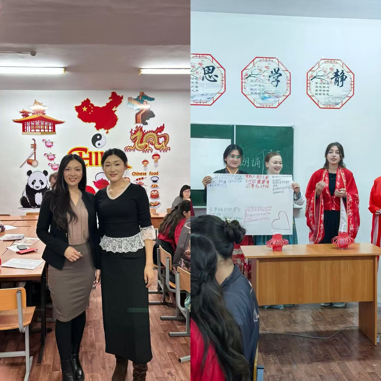 11月10日,一场以“诵文促言”为主题的中哈合作汉语口语公开课在塔拉兹杜拉蒂大学举行。本次公开课由兰州理工大学文学院派出的实习教师,24级国际中文教育硕士生王海晓、王小丽与杜拉蒂塔拉兹国立大学本土汉语教师阿米娜(Амина)协作执教。兰州理工大学文学院教师罗娟娟及杜拉蒂塔拉兹国立大学世界语言系全体教师共同参加了本次活动。