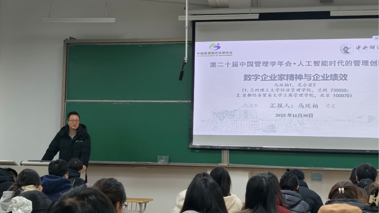 马老师结合参加“第十一届市场导向的绿色低碳发展国际研讨会”和“第二十届(2025)中国管理学年会”两次学术会议的心得,作了题为“人工智能与绿色低碳背景下的经济管理问题”的学术报告。在报告中,马老师以两次学术会议的主题为切入点,概括了两次会议的主要内容、该领域最新的理论发现和研究成果。在此基础上,重点围绕“数字化转型与企业绿色投资”“数字企业家精神与企业绩效”两个主题展开汇报,系统阐述数字技术应用对企业发展和行为选择的影响。