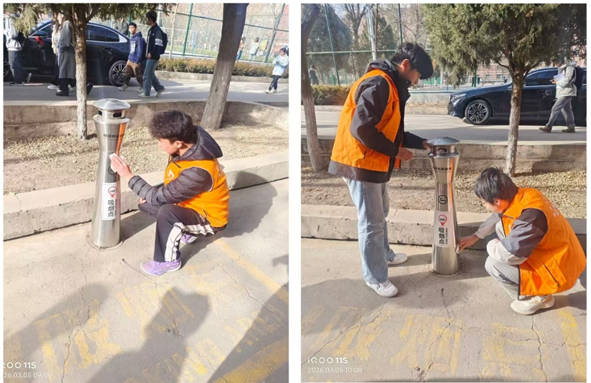 除主题插画展外,志愿服务队还组织志愿者开展校园“两禁一允许”吸烟点卫生清扫活动,用实际行动践行雷锋精神。活动中,志愿者们对校园内指定吸烟点进行全面清理,认真清扫地面烟头、纸屑、杂物,擦拭吸烟点周边设施,细致整理环境卫生,同时向过往师生宣传吸烟危害及校园控烟规定,引导大家共同维护整洁、文明的校园环境。