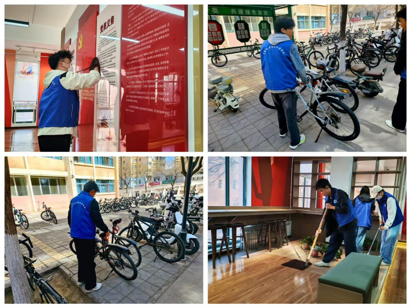 与此同时,校园环境整治工作也同步展开。在西校区,志愿者们将随意停放的自行车一一摆放至指定区域,原本杂乱的停车点变得井然有序;在南村EG宿舍,大家拿起扫帚、抹布,对连廊公共区域进行深度清洁,让宿舍环境焕然一新。点滴行动,传递着对校园的热爱与责任。