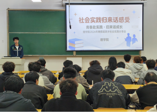 为进一步推动三全育人走深走实,深化实践育人成效,引领青年学子在社会实践中砥砺品格、增长本领、服务社会。3月26日,理学院在观成楼104教室举办“社会实践归来话感受”——2026年寒假“返家乡”社会实践分享会,此次分享会以“青春赴实践·归来话成长”为主题,来自各年级各专业的同学齐聚一堂,听代表们分享实践故事,传递青春力量。