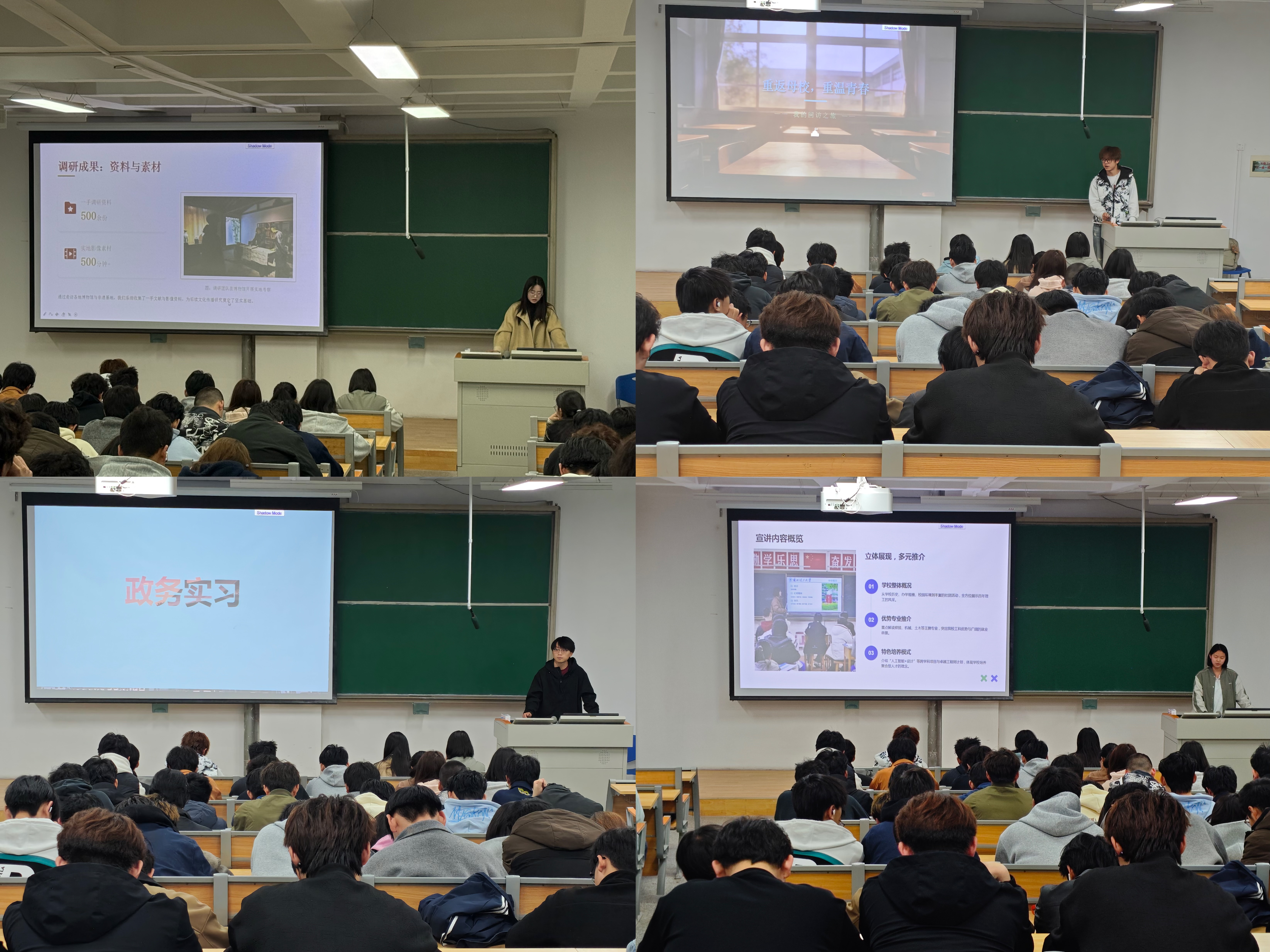 分享会上,同学们通过PPT展示、视频播放等形式,分享实践过程中的所见所闻、所做所获,从不同实践领域出发,展现了青年学子的实干与担当。分享内容涉及政务实习、回访母校、探访革命旧址、优秀传统文化调研等内容。