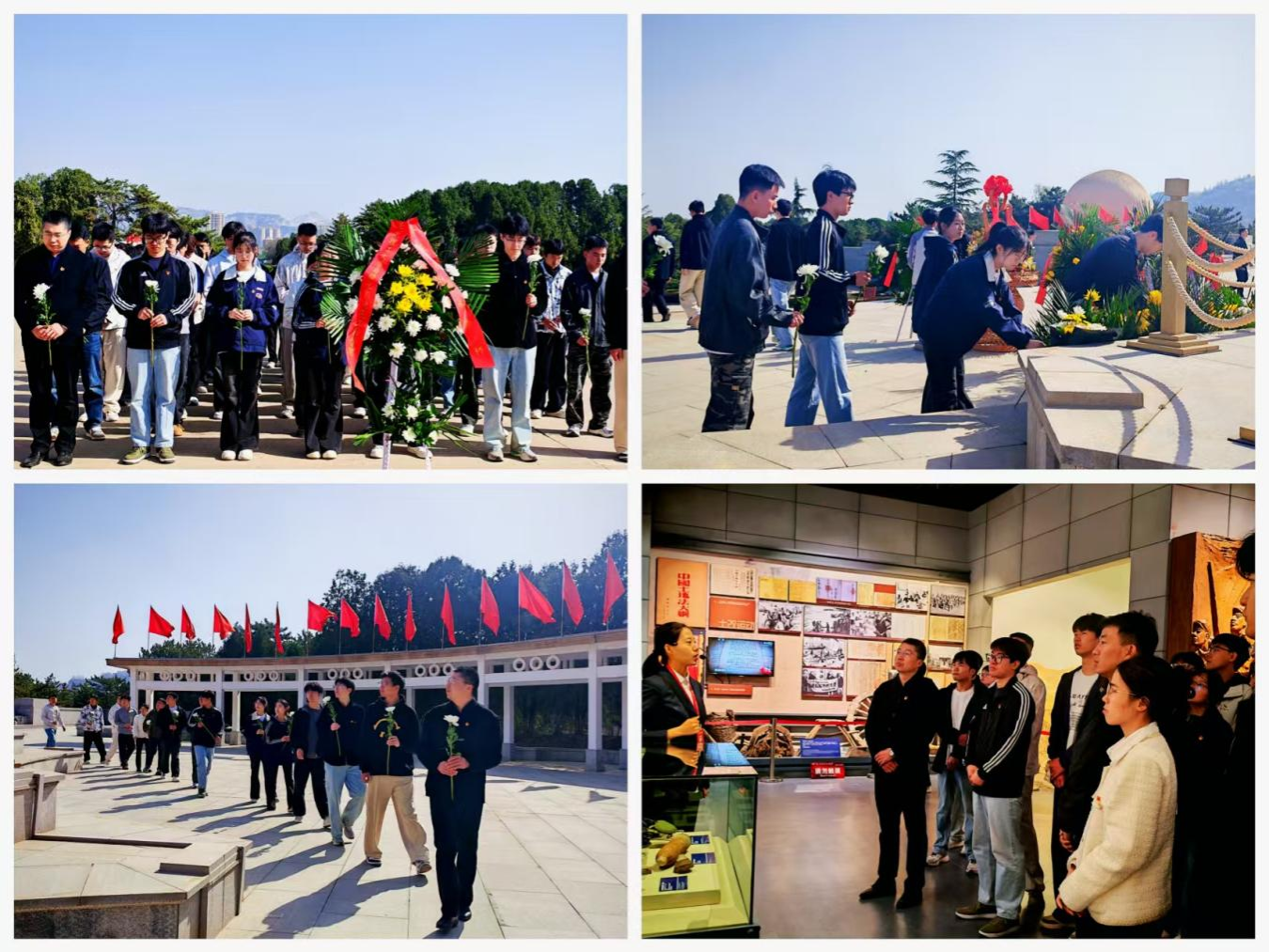 活动在庄严肃穆的氛围中拉开帷幕。全体人员整齐列队,现场奏唱国歌,激昂的旋律激荡着每个人的爱国之心。国歌唱毕,全体师生向革命先烈默哀致敬,表达深切哀思。随后,刘炜代表学院向烈士敬献花篮,全体人员依次献花,追忆先烈英勇事迹,感悟革命精神。仪式结束后,师生们走进革命纪念馆,通过历史图片、文献资料和革命文物,回顾峥嵘岁月,深刻体会革命先辈坚定的理想信念与不懈的奋斗精神。