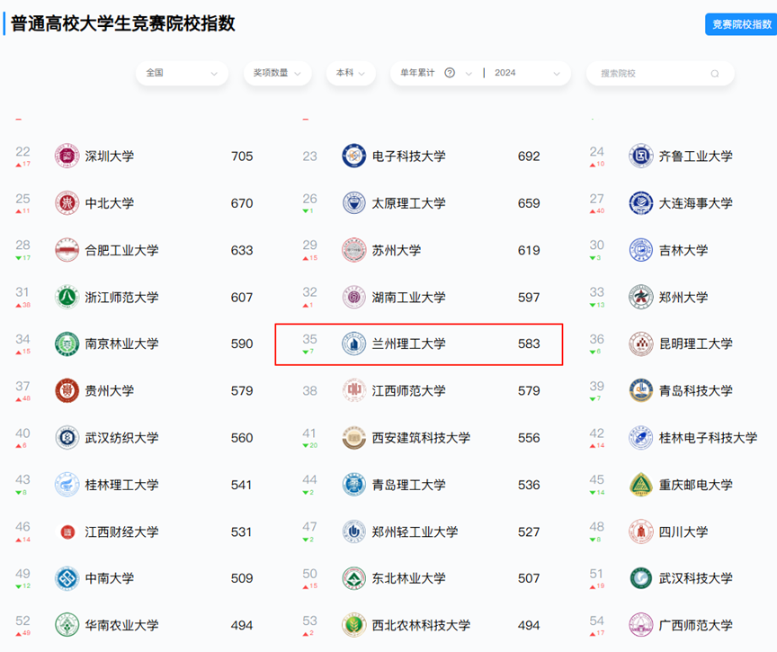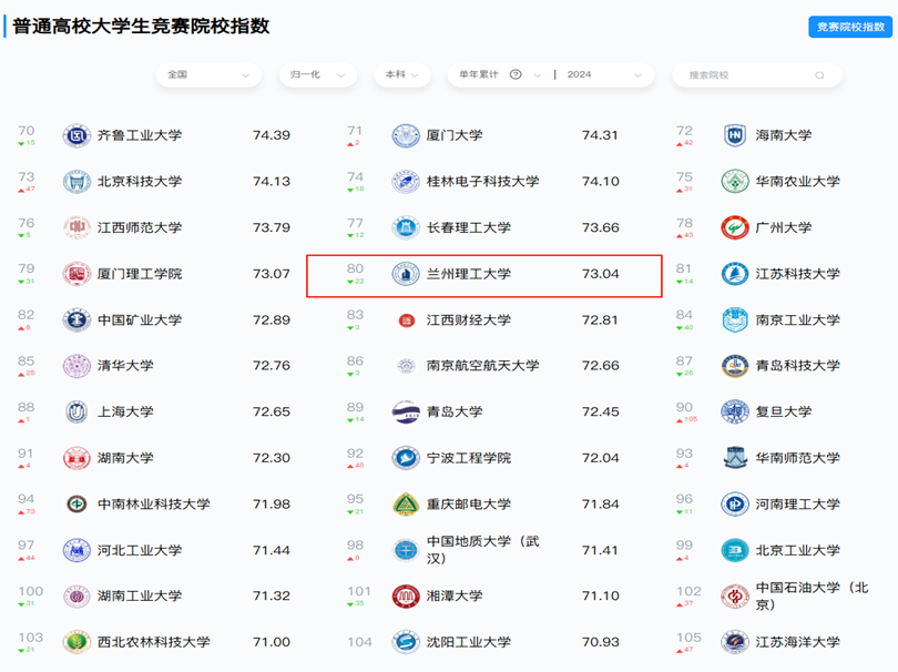 近日,高等教育数智评价研究中心发布了普通高校大学生竞赛院校指数。兰州理工大学以1889项获奖、总分75.57的成绩,在“2020—2024年普通高校大学生竞赛院校指数榜单”中位列第64名,奖项数量位列全国35名;以583项获奖、总分73.04的成绩,在“2024年全国普通高校大学生竞赛院校指数榜单”中位列第80名,奖项数量位列全国第35名。各项排名均稳居全省高校首位。