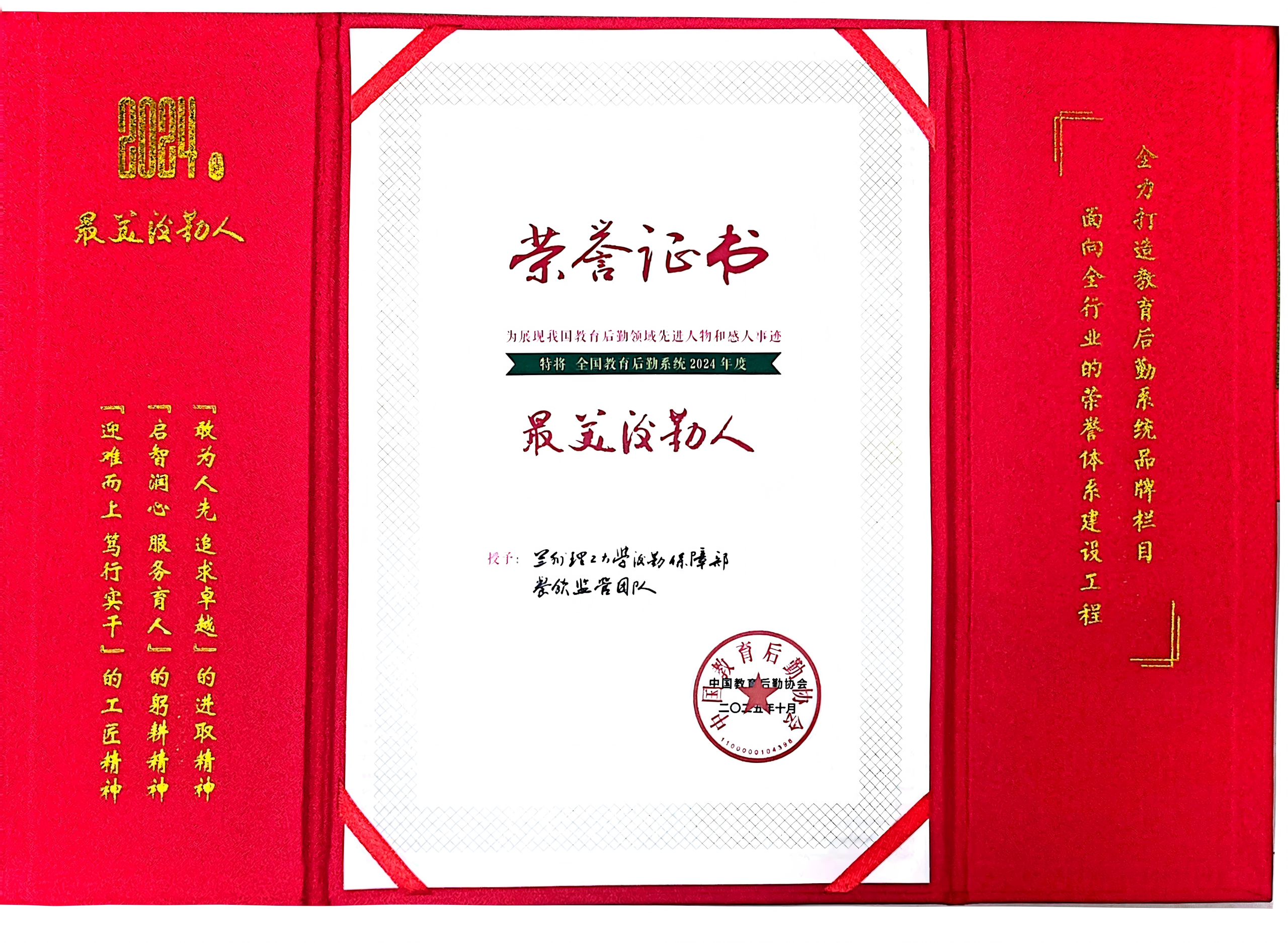 今年年初,中国教育后勤协会在全国教育后勤系统内组织开展了以“新时代新奉献”为主题的“2024年度最美后勤人”推举活动,自活动开展以来,共收到来自全国29个省、自治区、直辖市的335项个人、171项团队申报信息。通过多维度的综合评定,最终推举出高校领域的60项个人、40项团队,中小学领域的20项个人与团队入选“2024年度最美后勤人”。学校本次荣誉的取得,是后勤保障部餐饮监管团队在学校党委的领导下砥砺奋斗的优异成绩,更是对未来前行的鼓舞和激励。