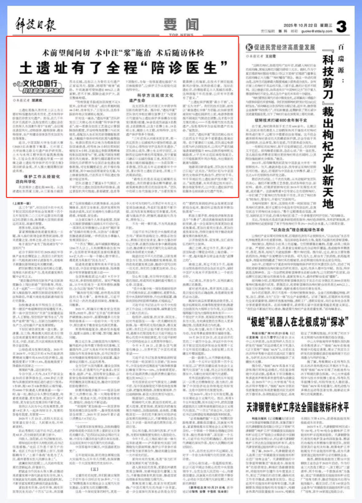10月22日,《科技日报》要闻版刊发题为:术前望闻问切 术中注“浆”施治 术后随访体检——土遗址有了全程“陪诊医生”的文章,全文如下: