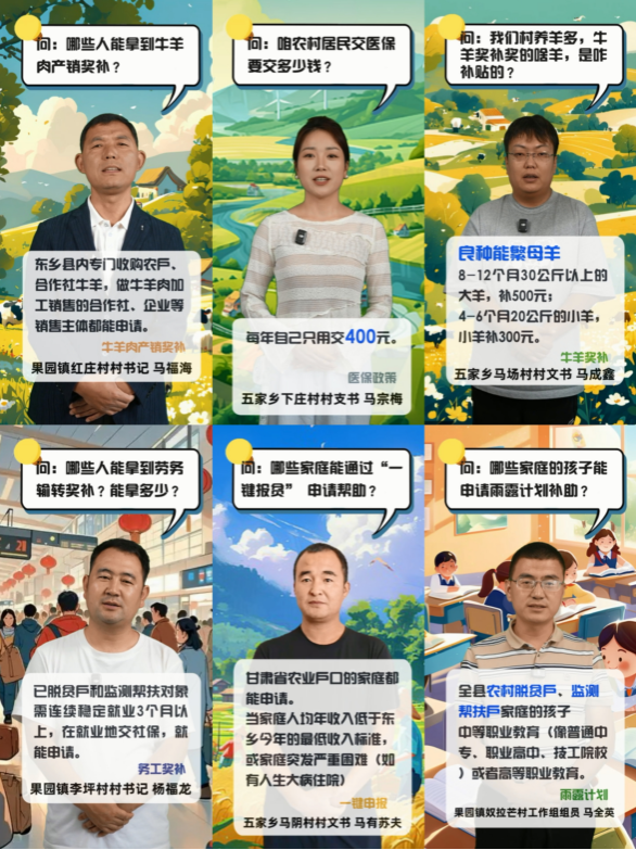 在学校的统筹推动下,马阴村的成功试点,形成了可复制、可推广的“漫画+数字人”政策宣传新模式,也逐步扩展至其他5个帮扶村。我们在每个村委推选一名熟悉村情民情、政策领悟力强、表达沟通能力好的骨干干部,成为本村的“数字人讲解员”,制作了各村的数字人讲解视频。短短时间,经过6个驻村工作队广泛的宣传,帮扶村的医保、牛羊奖补等咨询量明显上升,村民对一键申报的知晓率接近100%。家中有孩子考上大专的,已经准备好开学就申请“雨露计划”……这一创新模式的成功实践,随后也获得了东乡区的关注与推介,通过其官方平台向全县范围进行推广宣传。最令人动容的是,有村民主动将手册借给返乡邻居,还有人在群里提醒:“今年可别再错过医保缴费了!”彼时,政策宣传不再是工作队的“独角戏”,已悄然变成全村人参与的“大合唱”。