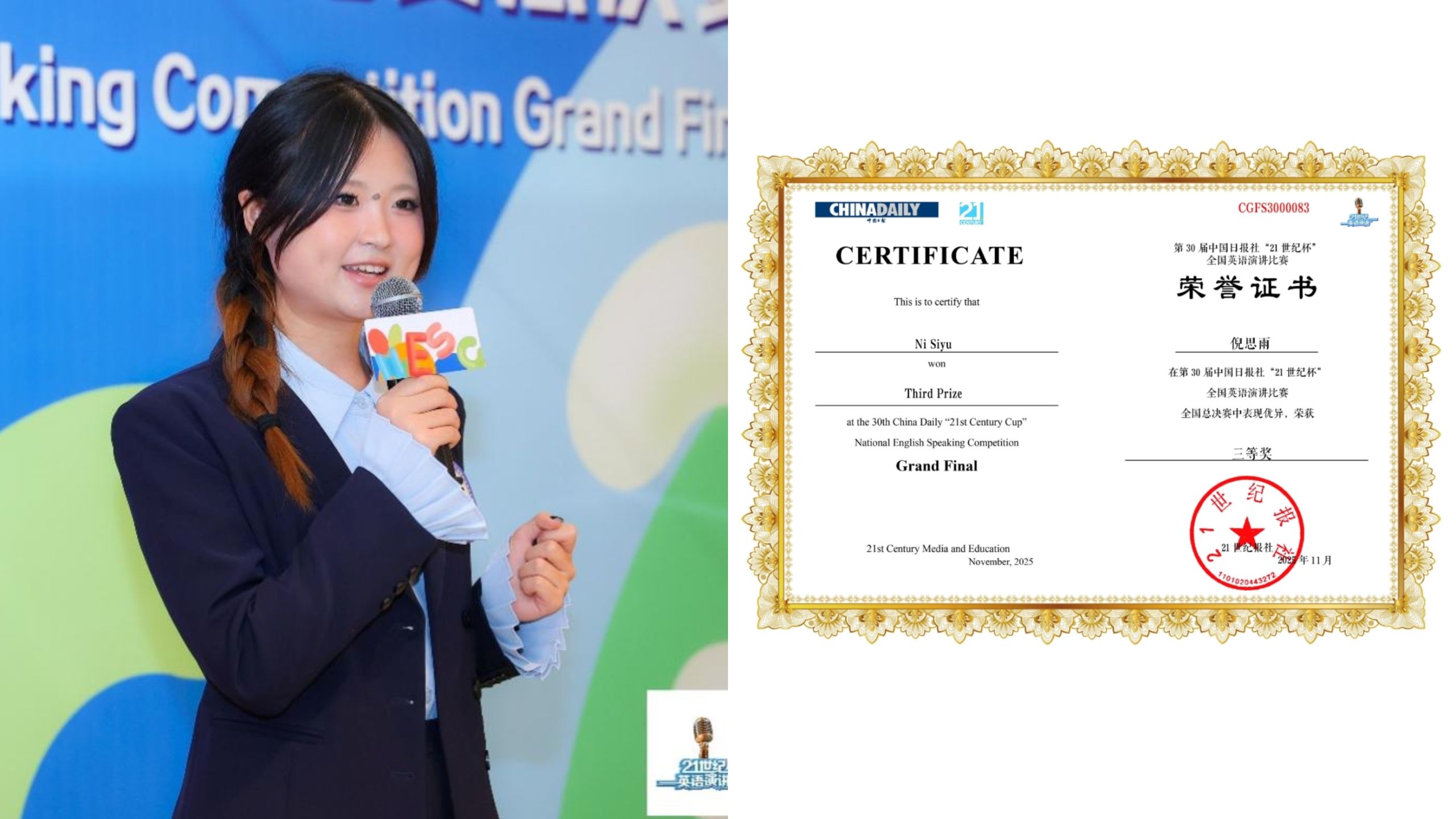 11月13日至17日,在杭州落幕的第30届中国日报社“21世纪杯”全国英语演讲比赛全国总决赛上,外国语学院学子斩获全国三等奖2项。参赛同学的英语语言功底扎实,演讲主题鲜明、内容充实,逻辑层次清晰,表达流畅自然,既传递了青年视角的思考,又展现了当代大学生的精神风貌,赢得了评委团的专业认可。