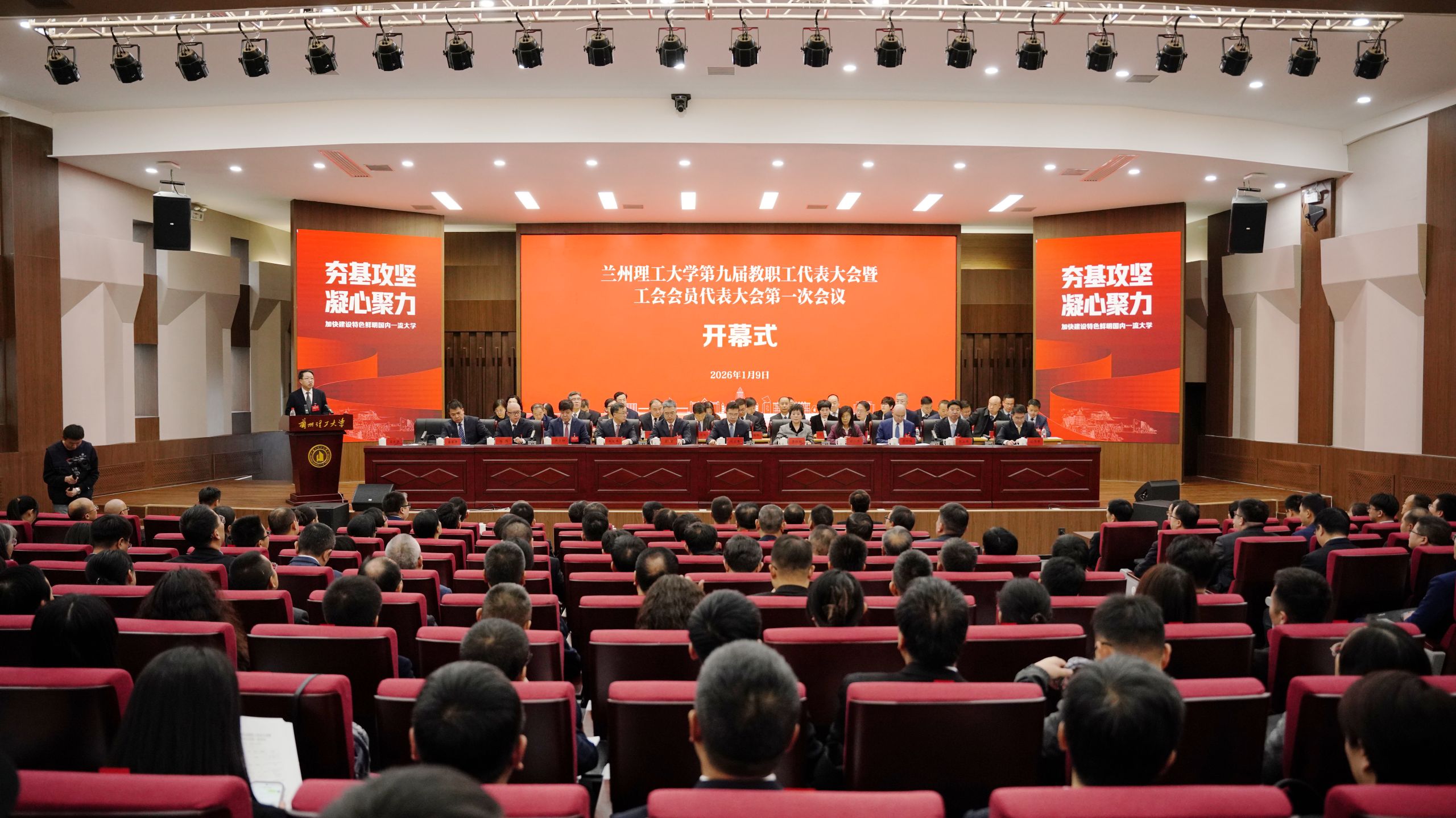 1月9日下午,兰州理工大学第九届教职工代表大会暨工会会员代表大会第一次会议在兰工坪校区学术交流中心二楼报告厅开幕。全体校领导、教职工代表、列席代表、特邀代表等近300人齐聚一堂,共商学校发展,共绘特色鲜明国内一流大学建设新蓝图。开幕式由党委常委、副校长吕文英主持。