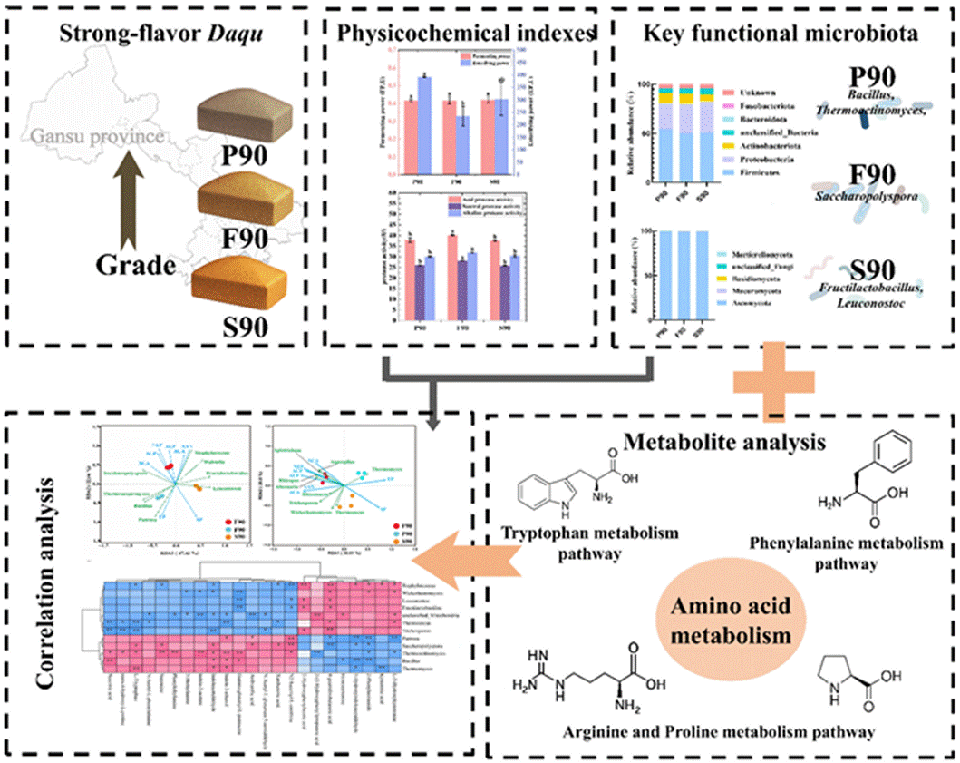 近日,生命科学与工程学院生物资源开发与环境健康研究团队在国际知名期刊《International Journal of Food Microbiology》(中科院一区Top期刊,IF=5.2,)和《Food Chemistry: X》(中科院一区Top期刊,IF=8.2)连续发表重要研究成果。团队围绕我省陇南地区浓香型白酒酿造过程开展系统性研究,揭示了驱动发酵进程并塑造风味品质的关键微生态机制,为西部特色微生物组功能开发与应用提供了新的科学依据。论文“Deciphering the characteristics of strong-flavorDaquat different grades through integrated microbiome and metabolome analysis”整合理化组、微生物组与代谢组,直观呈现了不同等级浓香型大曲理化特性、微生物群落以及功能代谢的差异,并基于关联分析揭示了优级大曲中关键微生物促进氨基酸代谢和酯类前体积累的作用机理,为大曲质量评价与品质提升提供重要理论和技术参考。