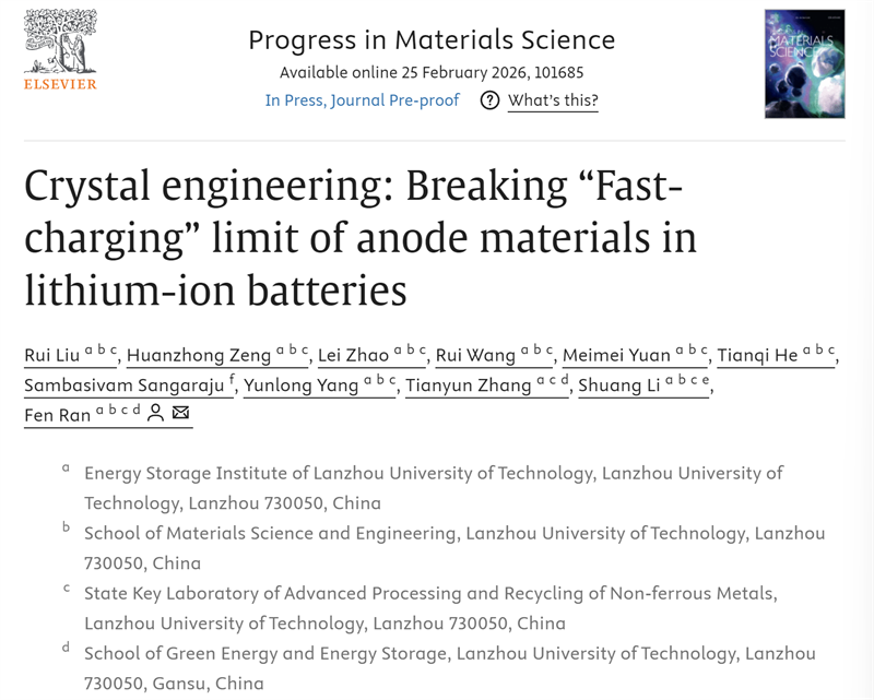 近日,学校储能材料及系统学科交叉中心在材料科学领域取得重要学术进展,以冉奋教授为通讯作者、材料学院博士生刘蕊为第一作者的观点文章“Crystal Engineering: Breaking ‘Fast-charging’ Limit of Anode Materials in Lithium-Ion Batteries”发表于国际顶级期刊《Progress in Materials Science》。该期刊影响因子高达40,为中国科学院一区TOP期刊,在材料学界享有极高声誉。