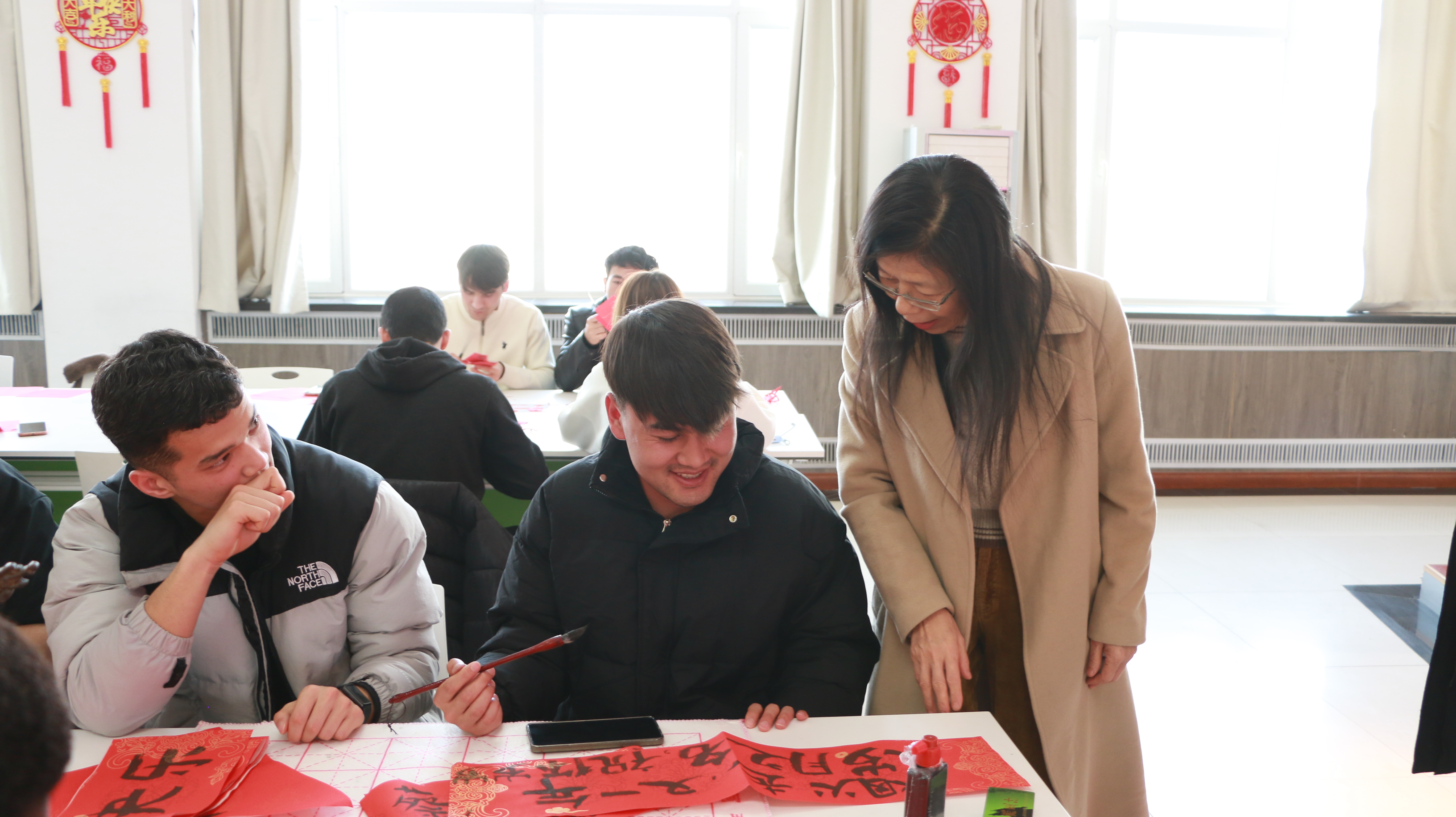 现场暖意融融,国际中文教师薛洁嵘用生动通俗的语言,向学生们讲解春节的起源、传统习俗及马年的文化寓意,带领学生感受“团圆、和睦”的春节文化内核。薛洁嵘老师现场指导学生开展剪纸、写春联、写福字等民俗活动,手把手教学传授技巧。