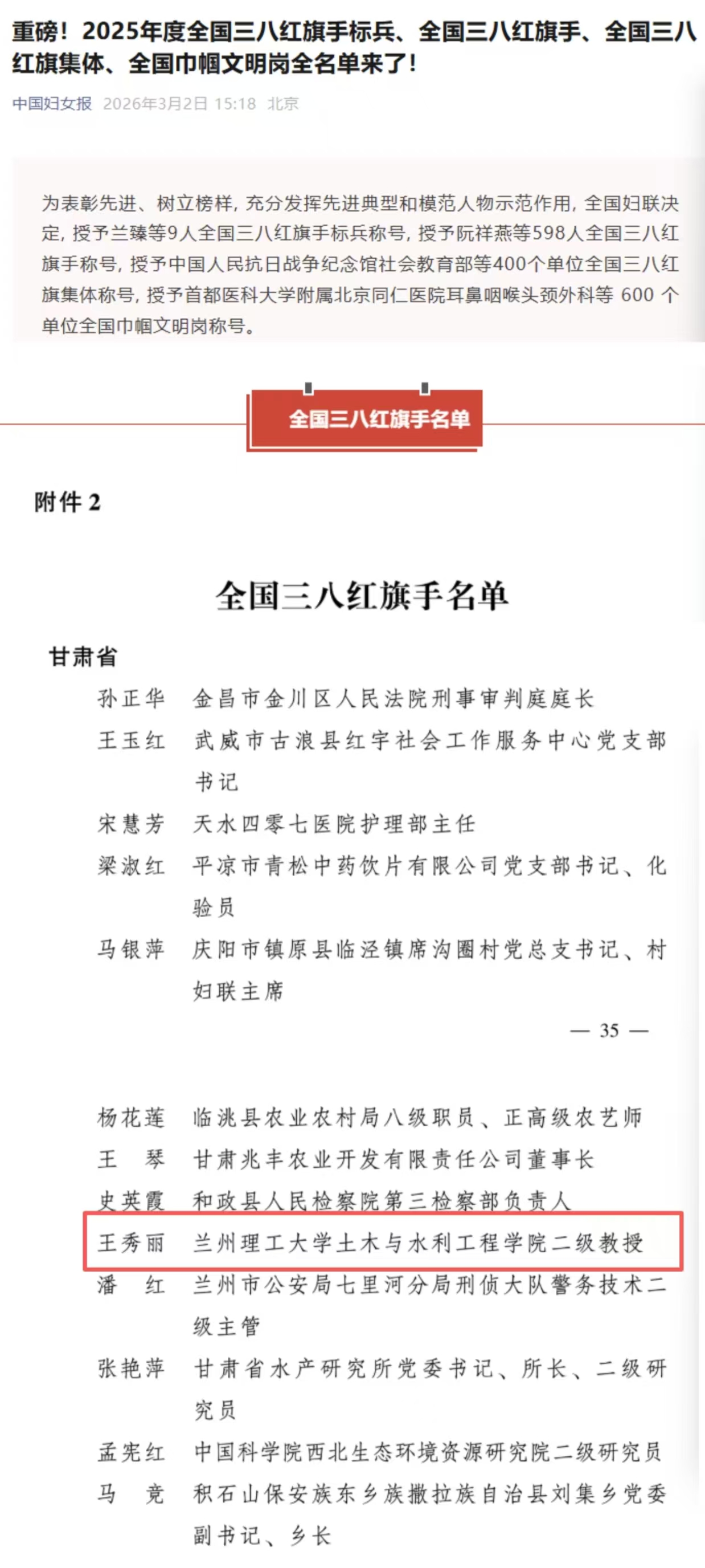 为表彰先进、树立榜样,充分发挥先进典型和模范人物的示范作用,3月2日,全国妇联正式公布了2025年度全国三八红旗手标兵、全国三八红旗手、全国三八红旗集体、全国巾帼文明岗名单。我校土木与水利工程学院王秀丽教授荣获“全国三八红旗手”荣誉称号。