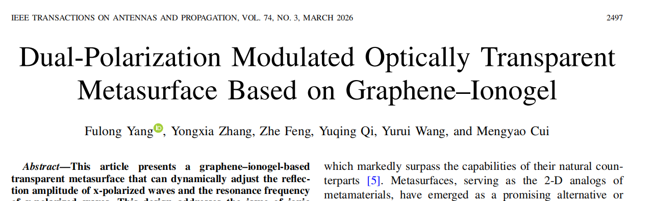 近日,微电子现代产业学院杨富龙副教授课题组在电磁天线与超表面器件领域取得重要研究进展。相关成果以“Dual-Polarization Modulated Optically Transparent Metasurface Based on Graphene–Ionogel”为题,发表于IEEE Transactions on Antennas and Propagation(IEEE TAP)。该期刊为中国科学院一区TOP、JCR Q1期刊,是国际天线与电磁传播领域公认的顶级旗舰期刊,具有广泛学术影响力。