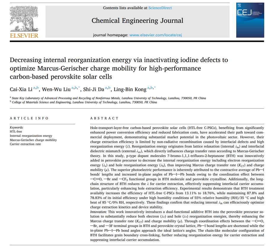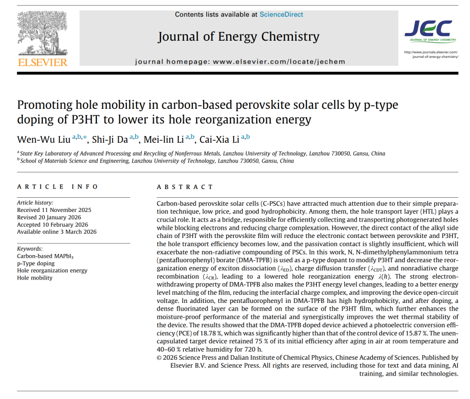 近日,国家重点实验室在绿色长寿命碳基钙钛矿太阳能电池研究中取得重要进展,在国际材料科学领域顶级期刊《Journal of Energy Chemistry》(中国科学院一区,TOP期刊,IF:14.90)和《Chemical Engineering Journal》(中国科学院一区,TOP期刊,IF:13.20)上连续发表了题为“Promoting hole mobility in carbon-based perovskite solar cells by p-type doping of P3HT to lower its hole reorganization energy”和“Decreasing internal reorganization energy via inactivating iodine defects to optimize Marcus-Gerischer charge mobility for high-performance carbon-based perovskite solar cells”的研究论文。两篇论文均以兰州理工大学为第一完成单位,主要由硕士研究生达世纪、博士研究生李彩霞完成,刘文武副研究员为第一通讯作者,孔令斌教授为共同通讯作者。