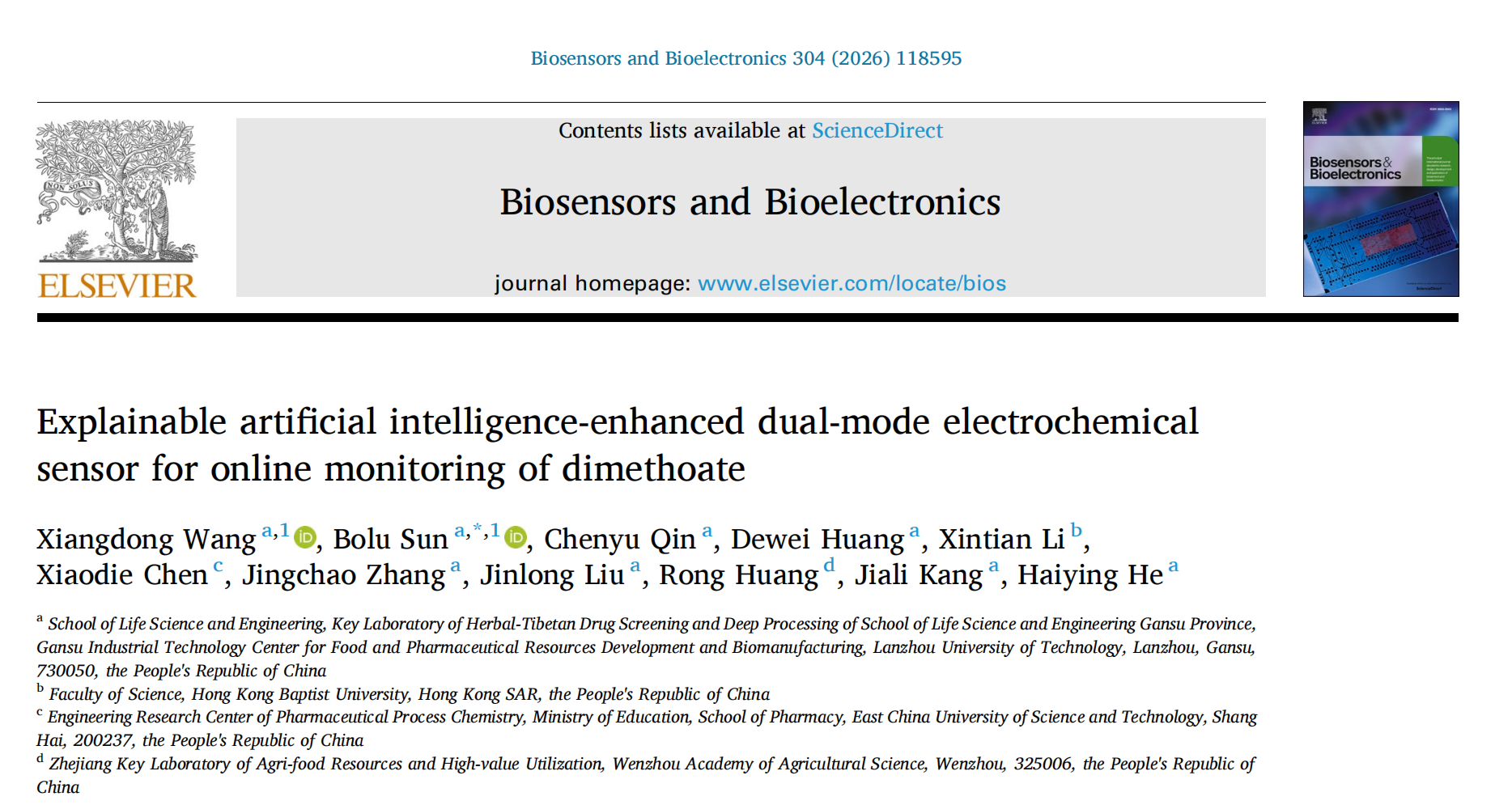 近日,生命科学与工程学院疾病精准诊疗前沿技术开发研究团队在国际知名期刊《Biosensors and Bioelectronics》(中国科学院一区Top期刊,影响因子10.5)上发表了题为“Explainable artificial intelligence-enhanced dual-mode electrochemical sensor for online monitoring of dimethoate”的重要研究成果。药学专业2024级硕士生王向东为论文第一作者,孙伯禄副教授为唯一通讯作者。